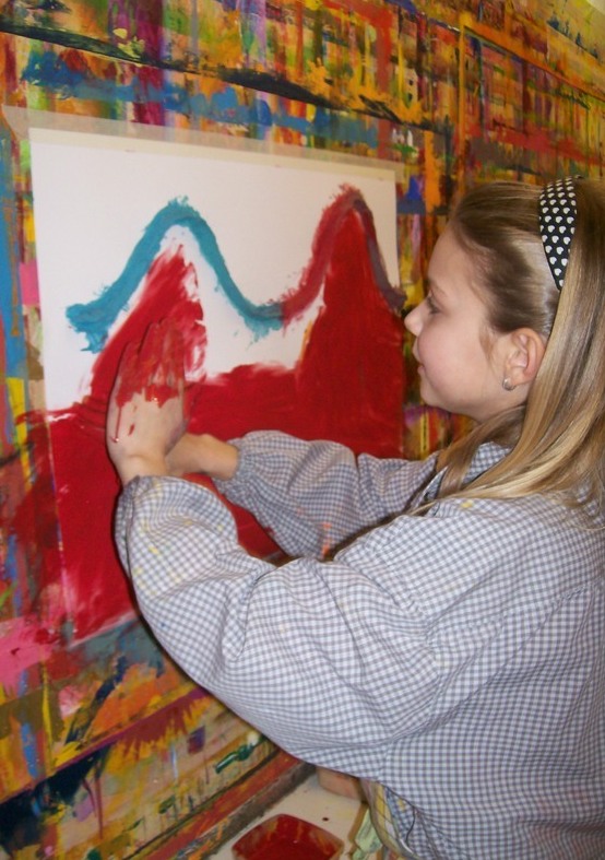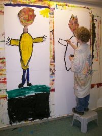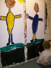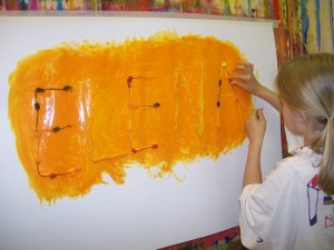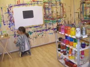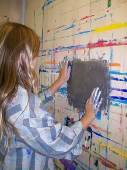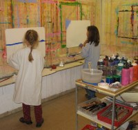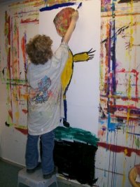 Ganz ohne vorgegebenes Thema lade ich die Kinder ein, spielerisch mit Farben zu experimentieren. Dabei können sie ihrer Phantasie, Entdeckungs-freude und Impulsen freien Lauf lassen. So kann ein selbstvergessenes, zufriedenes Tun entstehen. Die Kinder werden wertschätzend und achtungsvoll unterstützt, ihre ganz persönliche Ausdrucksweise entstehen zu lassen und umzusetzen. Dieses nonverbale Gestalten kann ein Mittel sein, sich auszudrücken und dabei ganz eigene Wege zu finden. Es ist auch eine Möglichkeit, den Kindern einen Ausgleich zu Ihrem oft leistungsorientierten Schulalltag zu bieten. Die Nachmittage sowie das Material sind in eine klare Ordnung eingebunden, was den Kindern Sicherheit gibt bei diesem experimentellen Tun. Das Malen im Stehen an der Wand bietet Bewe- gungsfreiheit. Wir arbeiten mit großen Blättern, je nach Bedarf mit Händen, Pinseln, Spachteln, Kleister, Schwämmen und verschiedenen Materialien. Und mit viel Spaß. |